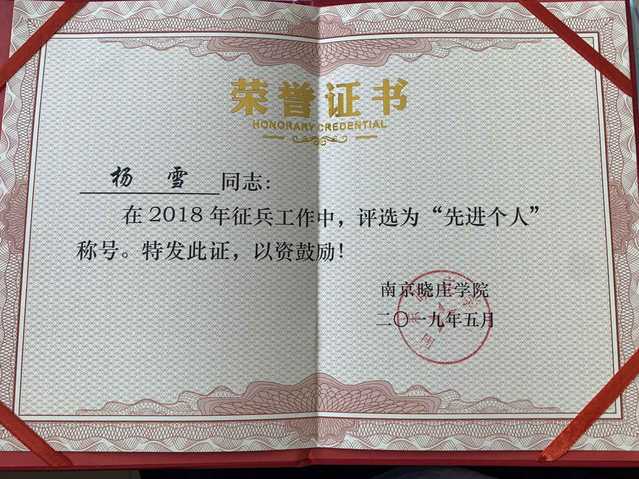 杨雪老师获得2018年征兵工作“先进个人”