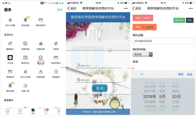 近日,南京晓庄学院商学院心理咨询“解忧坊”揭牌成立,其线上预约平台正式登录学校“i晓庄”官方APP。从此,该院2338名学生的“i晓庄”中多了一项定制服务,他们只需在生活服务模块中点击“解忧坊”图标,便可进行线上心理咨询预约。“解忧坊”咨询服务由4名取得国家心理咨询师资质的辅导员领衔,全体辅导员参与其中。他们在每个工作日的四个时间段提供咨询服务,等候学生线上“钦点”。