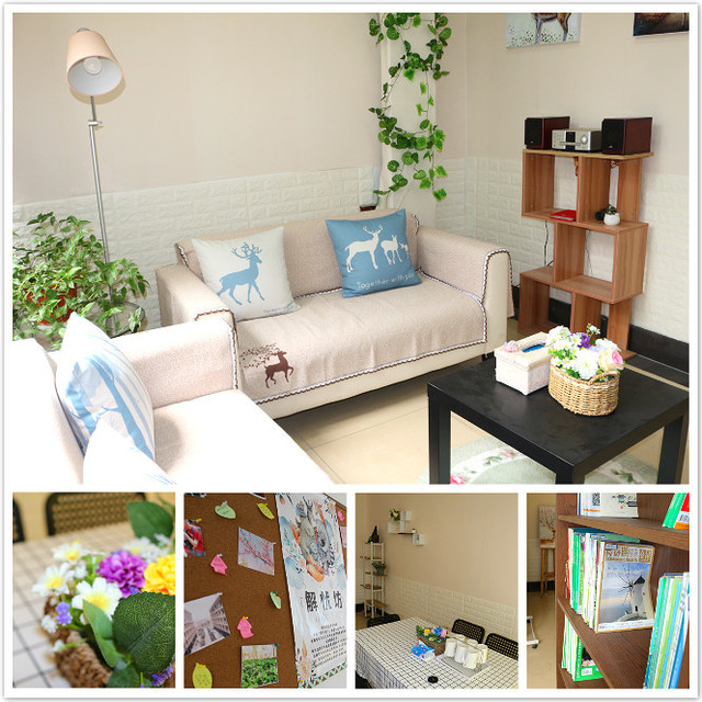 柔软的沙发配以北欧风格抱枕,小巧的多肉绿植、素雅的插花装点着咖啡色茶几,旁边293册心理健康类书籍、期刊、杂志陈列书柜间,对面墙上是三幅简约画,下方十几张音乐CD不经意地置于陈列架,悠扬的轻音乐从音箱中缓缓走来……惬意温馨的室内环境,让人很容易就能放松下来。